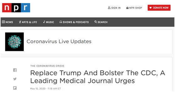 NPR:一家顶尖的医学杂志敦促:换掉特朗普,支持疾控中心