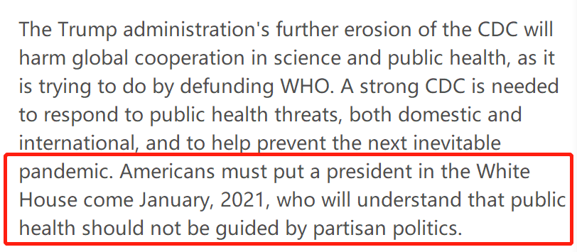 在最后,文章写道:“美国人必须在2021年1月前让一位总统入主白宫,而这位总统需要明白,公共卫生不应受到党派政治的影响。(Americansmust put a president in the White House come January, 2021, who will understandthat public health should not be guided by partisan politics.)”
